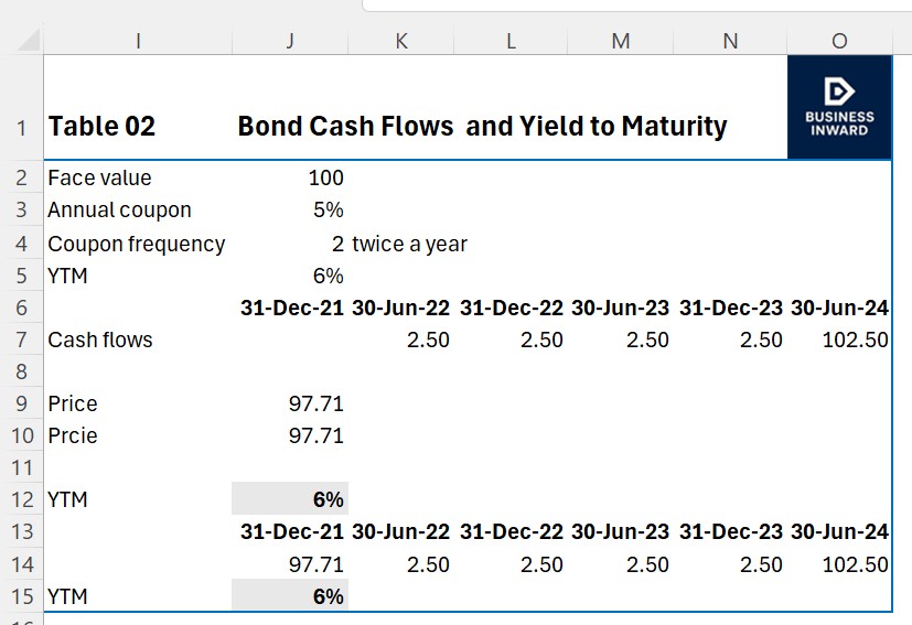 Bond YTM: =YIELD(J6,O6,J3,J9,100,J4,3)