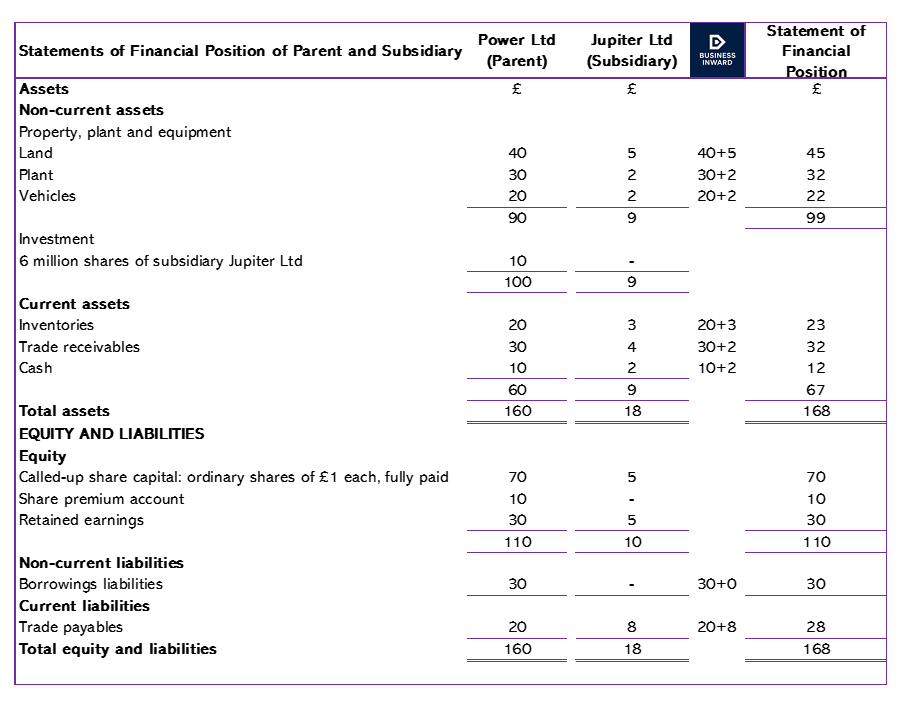The equity section is group statement of financial position is solely that of Power Ltd (Parent). The 10 million equity for Jupiter Ltd (Subsidiary) cancels out with the 10 million that relates to 5 million shares of Jupiter Ltd (Subsidiary) in the non-current assets section of Power Ltd’s (Parent) statement of financial position. Given that power Ltd (Parent) owns all of the subsidiary’s shares.