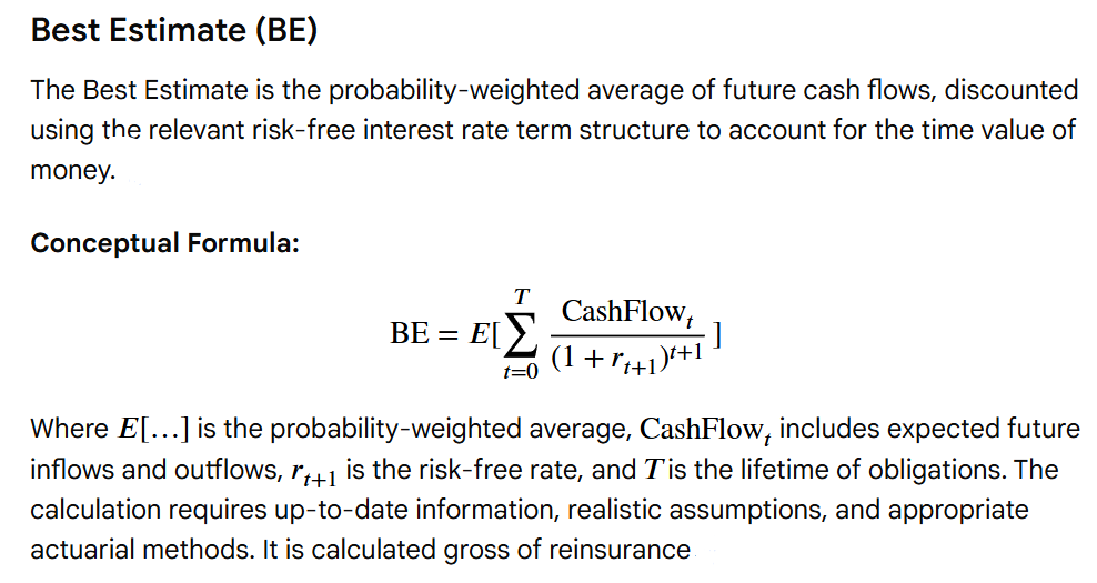 - Technical Provisions: The primary liability for insurers is technical provisions (future claims and policyholder benefits), which are calculated as the sum of a best estimate of future cash flows (discounted using a relevant risk-free interest rate) and a risk margin.
