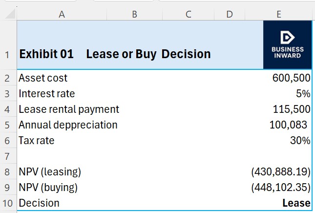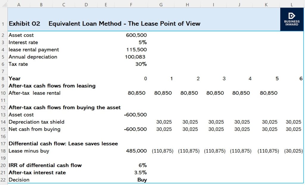 In Exhibit 02 below, the rationale behind the equivalent-loan method is to create a hypothetical loan that is in some way equivalent to the lease. As such, it becomes easy to understand whether it is preferable to lease or buy.