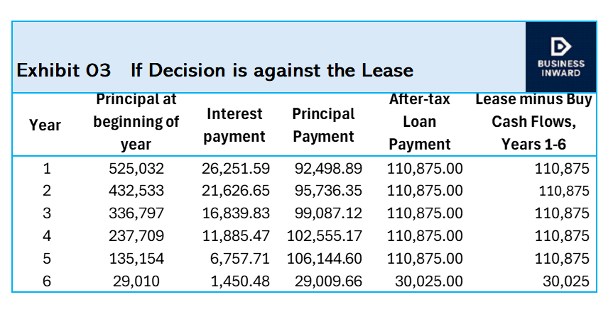 Exhibit 03 represents an alternative argument against a decision to lease. It appears that the firm can borrow 5% and also can borrow more money with the schedule of after-tax repayments whose outcome stemmed from the lease versus the buy.